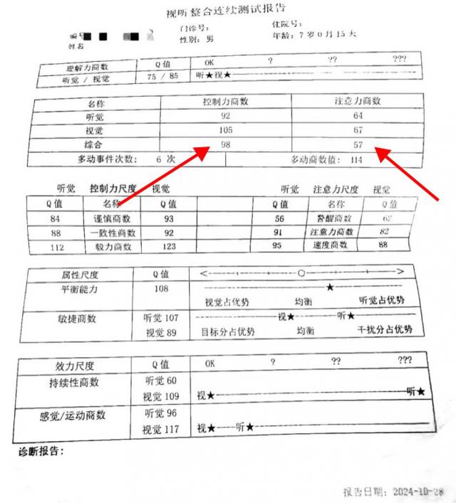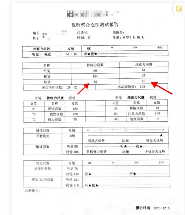 綜合檢測報告評分,注意商數(shù)綜合得分很低,正常情況下要注意。 85 分,這個調皮娃只有 40 分