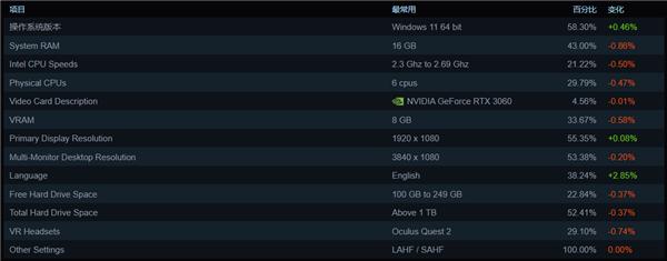 Win11Steam玩家占58.3%的新高!RTX 3060老將不死