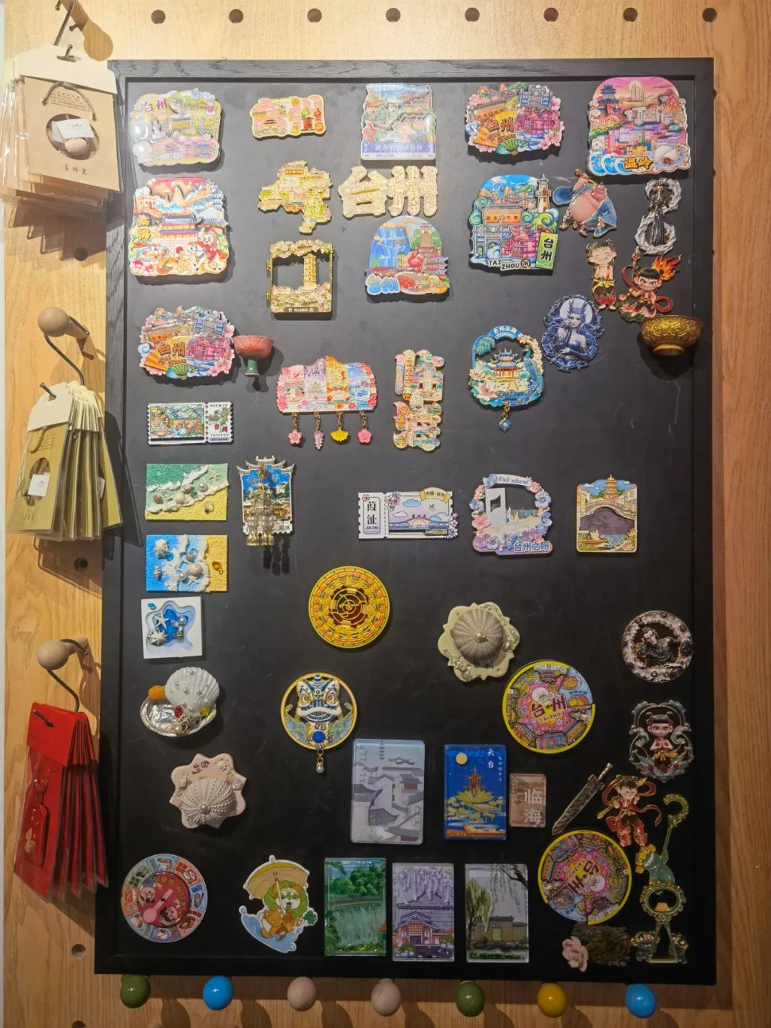 當(dāng)你走進(jìn)商店時,你不僅會看到琳瑯滿目的商品,還會看到熟悉的家鄉(xiāng)味道和年輕的創(chuàng)新活力。店內(nèi)展示了一系列圍繞“臺州”二字的文化創(chuàng)意產(chǎn)品:以椒江當(dāng)?shù)胤沁z品牌“謝楊貢姜”為代表的姜糖、姜茶、姜汁膏等系列產(chǎn)品,精心設(shè)計包括臺州9個縣市的冰箱貼紙和名片,每一件小物品都承載著地理和人情的坐標(biāo)。