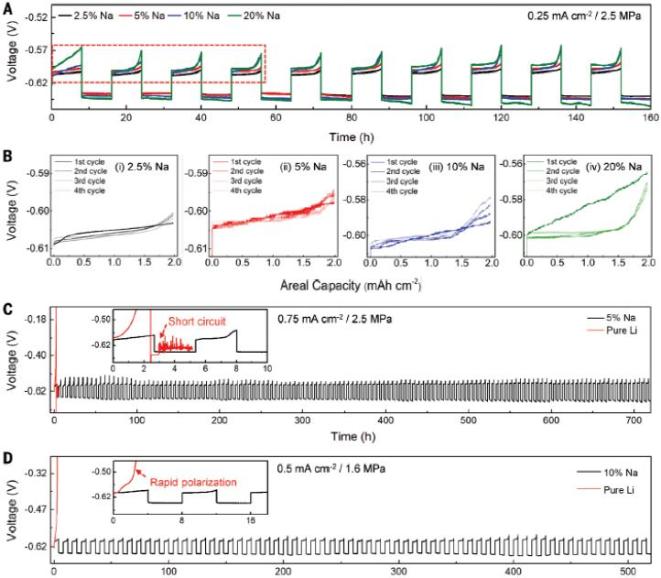 圖4. 鋰-鈉電極的恒流循環(huán)試驗(yàn)。