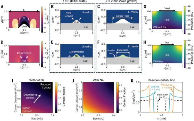 介質(zhì)模型闡明鈉的作用機(jī)制(圖5):應(yīng)力集中(圖5A)存在于純鋰界面孔眼邊緣,造成裂紋擴(kuò)展和電流聚焦(圖5B)-C,G);在壓縮應(yīng)力下,界面鈉域發(fā)生塑性流動(屈服強(qiáng)度0.16)–0.24 MPa),延伸覆蓋SSE表面(圖5D)-F),提高50%的界面接觸率(圖5I)-J),均勻的電流分布(圖5H,K)。納米壓痕證實(shí)鈉的硬度比鋰低54%,其形變動力學(xué)(非擴(kuò)散效應(yīng))是抑制孔洞的關(guān)鍵。該模型量化了電流強(qiáng)度和缺陷尺寸的影響:1 mA cm-2和0.8 在MPa環(huán)境下,含鈉電極的Li-SSE接觸率是純鋰的兩倍以上。