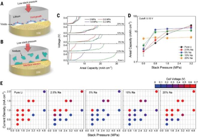 鋰金屬理論容量高(3860) mAh g-1)低電化學(xué)電位(-3.04 V vs. SHE)被認(rèn)為是固體電池(SSBs)理想的負(fù)極材料。但實(shí)際應(yīng)用受制于充放電過程中的界面接觸失效:剝離時(shí)鋰離子轉(zhuǎn)移到固態(tài)電解質(zhì)(SSE)由于鋰的自擴(kuò)散系數(shù)較低(~10-10),會產(chǎn)生界面位置。 cm?2; s-第一,位置堆積形成孔洞(圖1A),導(dǎo)致界面阻抗急劇增加,電流聚焦,造成鋰枝晶生長短路。目前的研究表明,需要施加極高的堆疊壓力來抑制孔洞(>7 MPa @1 mA cm-2),但鋰在μm尺度屈服強(qiáng)度增加,高壓會降低電池級能量密度。理想的堆疊壓力需要1 MPa,迫切需要新的界面調(diào)控策略。<1 MPa,亟需新式界面調(diào)控策略。