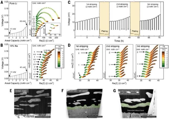 原點(diǎn)電化學(xué)阻抗譜(EIS)分析界面演變(圖2AA)-B):純鋰電極剝離5 mA·h cm-2之后,界面電阻從38 Ω·cm2猛增至200 Ω·高頻半圓膨脹和頂點(diǎn)頻率降低表明孔的形成(圖2A);而10% 41保持Na電極阻抗。 Ω·Cm2,只有低頻尾跡增長(圖2B),確認(rèn)鈉積累形成離子阻擋層,但不堵塞電荷輸送。冷凍電鏡觀測直接捕捉界面動態(tài):初始狀態(tài)中鈉域未接觸SSE(圖2E),剝離4E mA·h cm-2后形成數(shù)μSSE界面(圖2F)緊密粘貼m厚鈉層,支持74%鋰?yán)寐?圖S12);沉積2 mA·h cm-二是鋰在鈉層上均勻成核(圖2G),確認(rèn)鈉層可以作為高效集流體。數(shù)次循環(huán)阻抗譜(圖2C)-D)并且顯微成像顯示鈉在循環(huán)中不斷動態(tài)返回界面,保持觸摸完整。