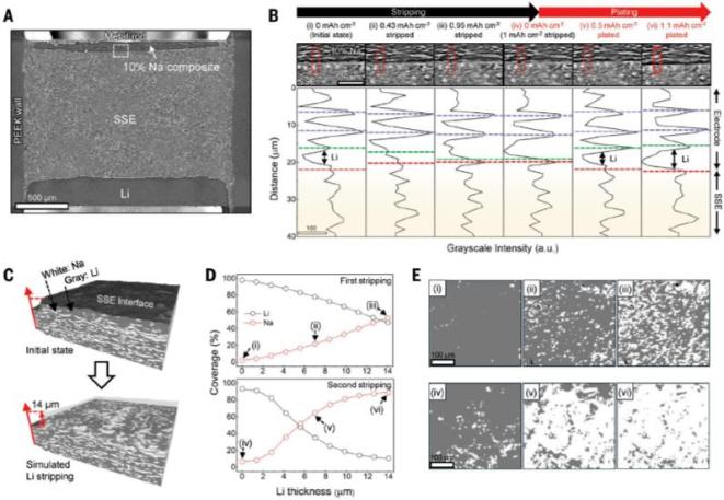 Operando x光斷層掃描(XCT)實(shí)時(shí)跟蹤界面演變(圖3AA)-B):初始狀態(tài)下鈉域與SSE之間有鋰隔離層(圖3BB)-i,灰峰谷分離);剝離0.43 mA·h cm-2時(shí)接近界面鈉域向SSE轉(zhuǎn)移(圖3BB)-ii,灰度峰與界面線重疊);剝離0.95 mA·h cm-2后鈉完全覆蓋界面(圖3B)-iii),而且沉積過程使鈉層被新沉積鋰推離界面(圖3B)-vi)。模擬剝離揭示鈉覆蓋率基于三維重構(gòu)的演變規(guī)律(圖3C)-E):第一次剝離時(shí),鈉覆蓋率隨鋰剝離線性增加(圖3D-i至iii),但由于沉積鋰層耗盡,二次剝離鈉覆蓋率急劇上升(圖3D-iv至vi),這種現(xiàn)象解釋了高鈉含量電極循環(huán)后電壓極化的加速現(xiàn)象。