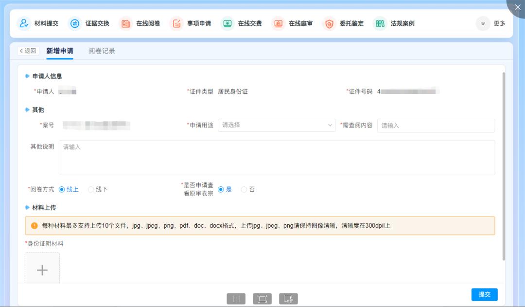 登錄系統(tǒng)后,在“我的案例”中找到相應(yīng)的案例號碼,點(diǎn)擊“在線閱卷”,如下圖2所示;進(jìn)入建立在線閱卷界面,填寫案例號碼、申請目的、查看內(nèi)容等。此外,還需要上傳身份證明和委托程序等材料。如下圖3所示: