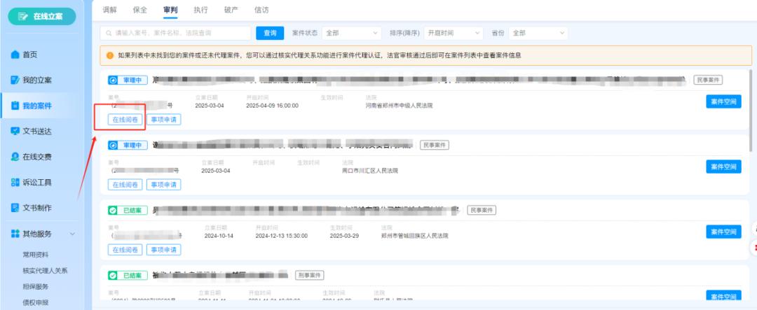 在“我的案例”中找到相應(yīng)的案例號碼,點(diǎn)擊“案例空間”,點(diǎn)擊“檔案查詢”查看已審核的在線閱卷申請,如下圖4所示: