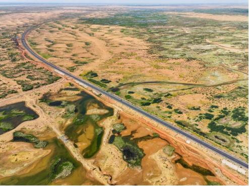 布其沙漠位于鄂爾多斯市杭錦旗庫,穿沙路兩旁綠意盎然(66) 月 6 日常攝影,無人機(jī)照片)。新華社記者 連振 攝