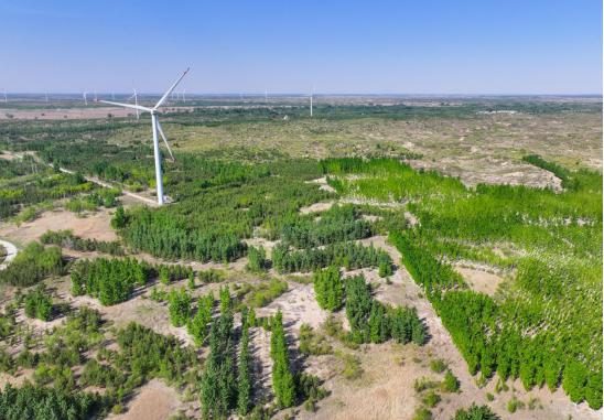 這是風(fēng)力發(fā)電機(jī)組(2024年)在內(nèi)蒙古通遼市科爾沁沙地“雙百萬畝”綜合治理工程努古斯臺項(xiàng)目區(qū)拍攝的。 年 5 月 15 日常攝影,無人機(jī)照片)。新華社記者 連振 攝