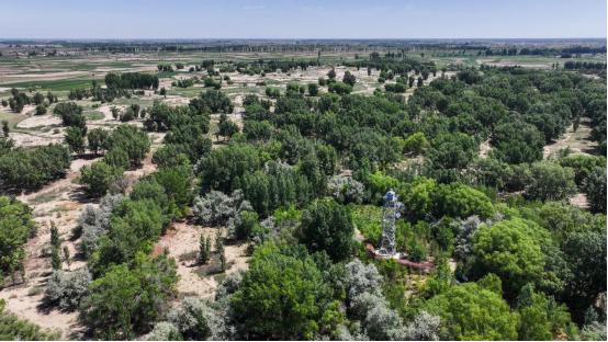 這是 6 月 5 日本在巴彥淖爾市臨河區(qū)拍攝的郁郁蔥蔥的國有新華林場(無人機(jī)照片)。新華社記者 連振 攝