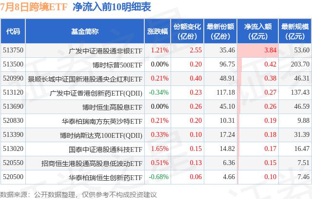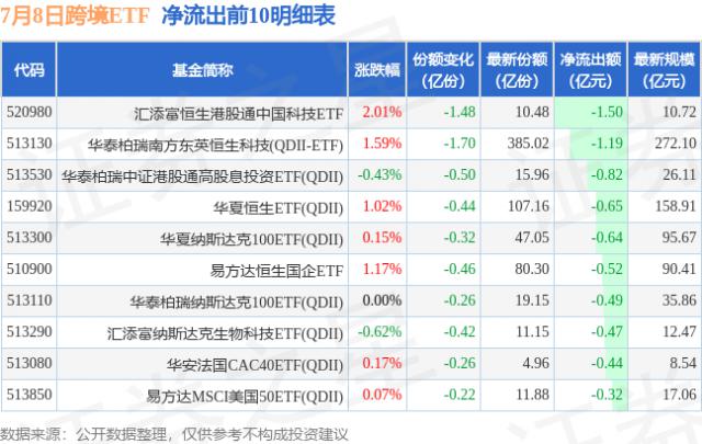 7月8日跨境ETF資金流向情況:凈流出1.17億元