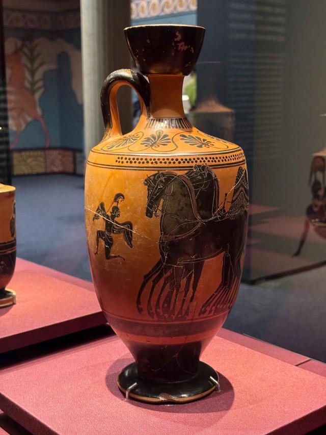 展柜里的黑陶涂油瓶,是公元前 6 世紀(jì)的“奧運(yùn)神器”。古希臘運(yùn)動(dòng)員賽前有特殊儀式:用它裝橄欖油涂抹全身,這不僅減少運(yùn)動(dòng)摩擦,更象征對(duì)身體的敬畏與凈化。