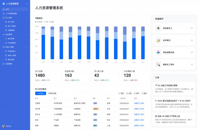 人力管理后臺也能清晰呈現(xiàn),從招聘、入職到績效評估都安排妥當。
