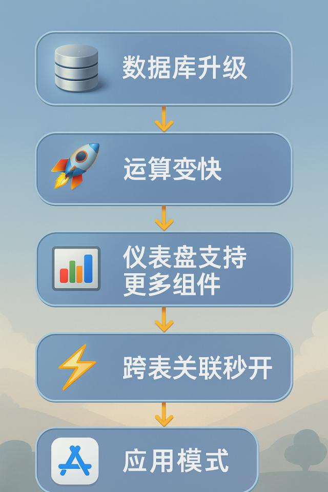 數(shù)據(jù)庫升級 → 運算變快 → 儀表盤支持更多組件 → 跨表關聯(lián)秒開 → “應用模式”成為可能。