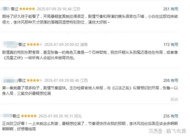不過,該劇剪輯和節(jié)奏欠佳,敘事不順暢,配樂奇怪。人物塑造也有不足,前3集很多工具性人物臉譜化,不如《以法之名》真實(shí)。張魯一演技出色,能很好地詮釋渾身是血自首的場景。高葉飾演的方靈淵出場表現(xiàn)一般,目前只是功能性敘事,期待她后續(xù)發(fā)力。白敬亭飾演的李沐風(fēng)正邪難辨,后續(xù)應(yīng)有更多戲份。