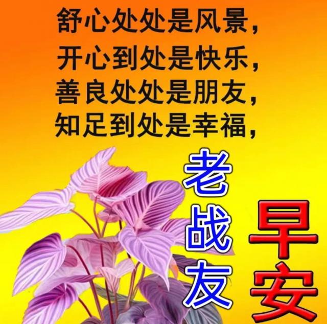 清晨第一縷陽光照亮,早安祝福送到老戰(zhàn)友身旁。愿你一天美好開啟,幸福與你常相伴。健康快樂多收獲,成功路上步步贏。早安,愿你的生活充滿甜蜜旋律。