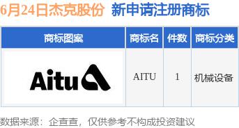 據(jù)證券之星消息,天眼查APP數(shù)據(jù)顯示,近日杰克科技股份有限公司新提交了“ AITU ”商標注冊申請。商標申請詳情如下: