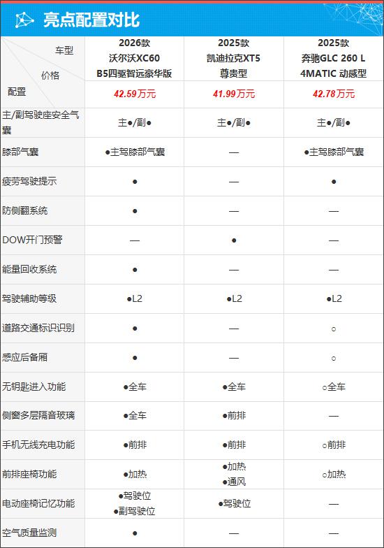 在車輛配置方面,沃爾沃XC60在安全性和實用性配置上更具優(yōu)勢。安全配置上,沃爾沃XC60和奔馳長軸距GLC都有主駕膝部氣囊,而沃爾沃XC60還配備了防側(cè)翻系統(tǒng)。實用性配置方面,沃爾沃XC60是三款車中唯一配備感應(yīng)后備廂和副駕駛位電動座椅記憶功能的車型。相比之下,凱迪拉克XT5在舒適性配置方面略有優(yōu)勢,奔馳長軸距GLC很多配置需要單獨花錢選裝。