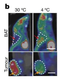 研究人員對(duì)唯一的癌癥患者進(jìn)行了為期7天、22℃的溫和“低溫治療”,結(jié)果令人振奮:患者棕色脂肪區(qū)域被激活,攝取葡萄糖增加,而縱隔淋巴瘤部位的葡萄糖信號(hào)顯著降低?、?/p>