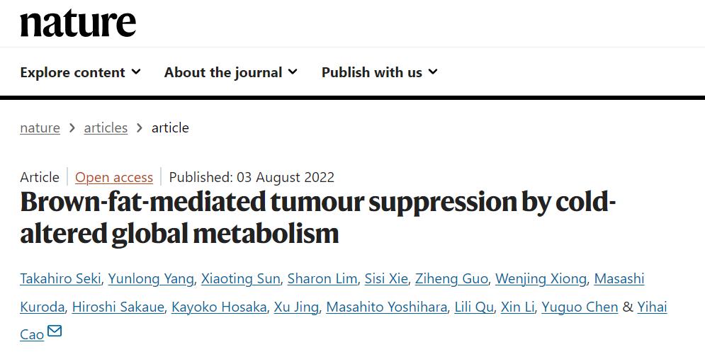 參考資料:①Seki, T., Yang, Y., Sun, X. et al. Brown - fat - mediated tumour suppression by cold - altered global metabolism. Nature 608, 421–428 (2022). https://doi.org/10.1038/s41586 - 022 - 05030 - 3