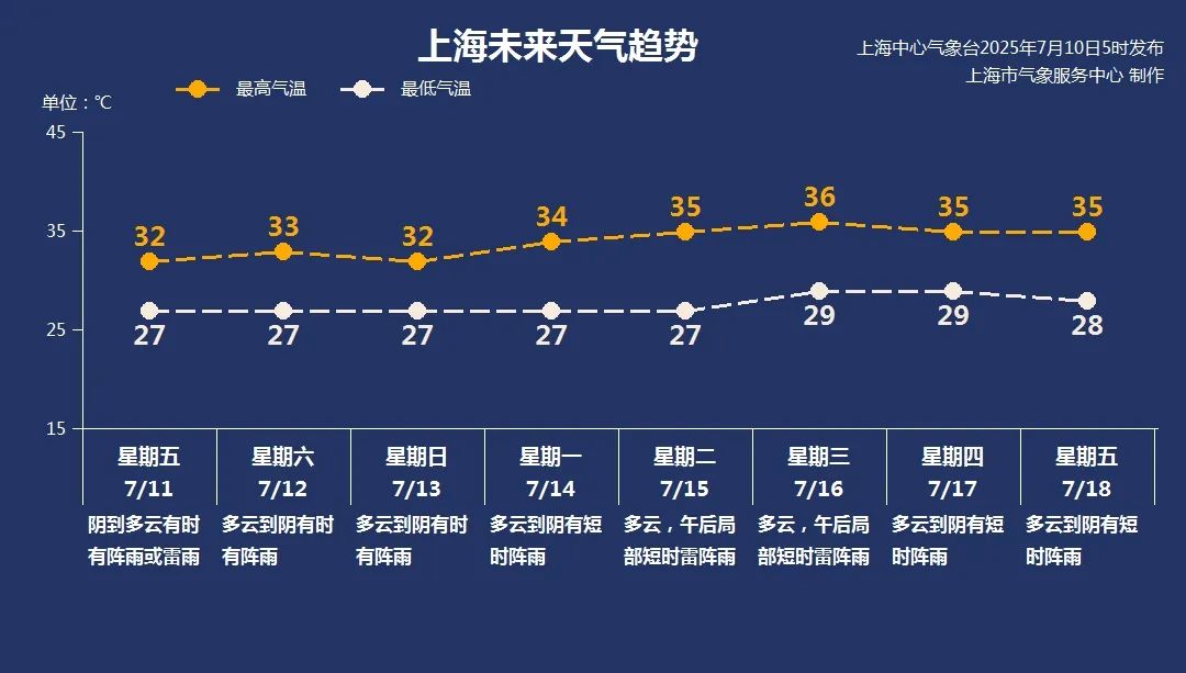 7月11日(周五):多云轉(zhuǎn)陰天,有時有陣雨或雷雨,氣溫27 - 32℃