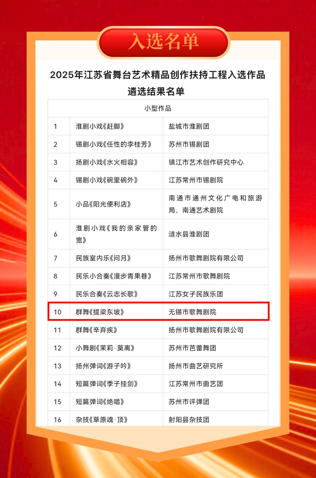 3、【市歌舞劇院群舞作品《提梁東坡》入選2025年江蘇省舞臺藝術(shù)精品創(chuàng)作扶持工程】近日,江蘇省文化和旅游廳《2025年江蘇省舞臺藝術(shù)精品創(chuàng)作扶持工程入選作品遴選結(jié)果名單》公示結(jié)束,由無錫市歌舞劇院(江蘇民族舞劇院)創(chuàng)排的群舞《提梁東坡》成功入選(無錫唯一)。一曲《提梁東坡》,無限江南情緣。芳茗蘊得人世愛,智者大隱山水間。舞蹈深度挖掘東坡文化資源,精心講述東坡與無錫的動人傳說,生動展現(xiàn)了一幅詩意盎然的江南畫卷。