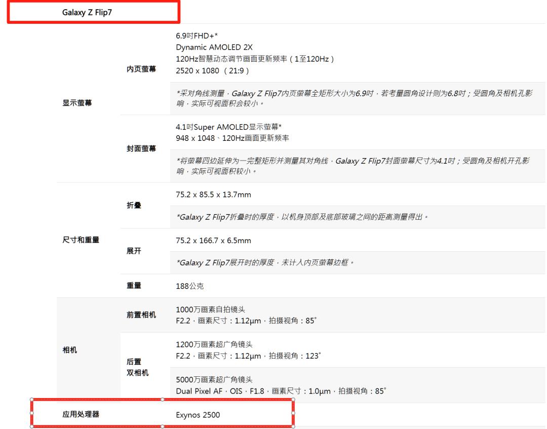 根據(jù)三星官網(wǎng)參數(shù)頁信息,三星Galaxy Z Flip7小折疊屏?xí)钶dExynos 2500,且未標(biāo)明有其他版本。