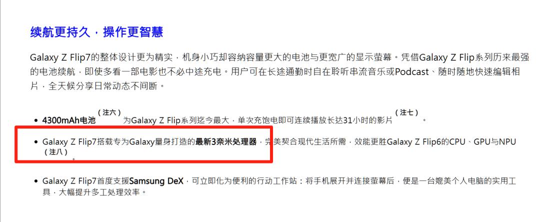 相比手機(jī)在外觀設(shè)計(jì)、影像拍照和AI體驗(yàn)上的升級,手機(jī)圈討論最熱烈的,當(dāng)屬三星Exynos 2500在剛發(fā)布的折疊屏Galaxy Z Flip7中應(yīng)用,并且國行版本的機(jī)型大概率也將搭載這顆芯片(若官網(wǎng)信息不變)。