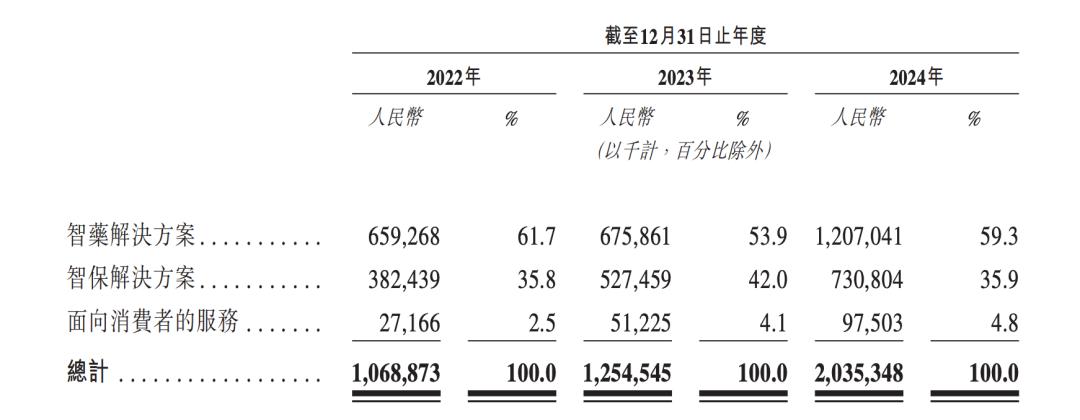 業(yè)績方面,2022年至2024年,鎂信健康的營收分別為10.69億元、12.55億元和20.35億元。其中,智藥解決方案對營收的貢獻占比分別為61.7%、53.9%、59.3%,智保解決方案對應(yīng)收的貢獻占比分別為35.8%、42%、35.9%。