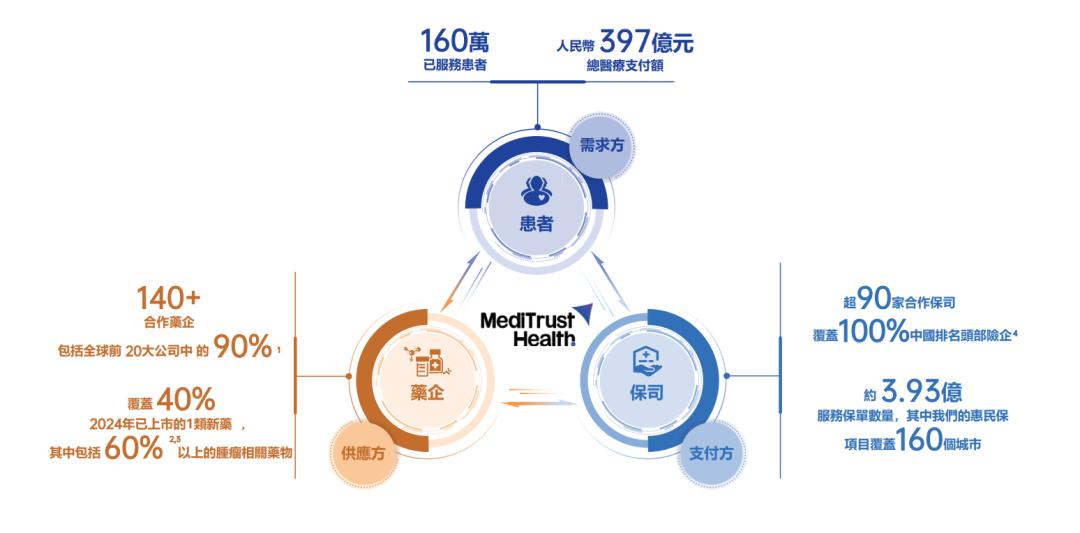 根據(jù)弗若斯特沙利文資料,以2024年平臺支付總額計算,鎂信健康是中國最大的創(chuàng)新藥械解決方案提供商;以服務(wù)的保單數(shù)量計算,它也是規(guī)模最大的創(chuàng)新健康保險解決方案提供商。截至2024年12月31日,公司累計服務(wù)保單數(shù)量約3.93億單,與超140家藥企以及超90家保險公司達成合作,2024年助力中國約40%的已上市創(chuàng)新1類藥落地。