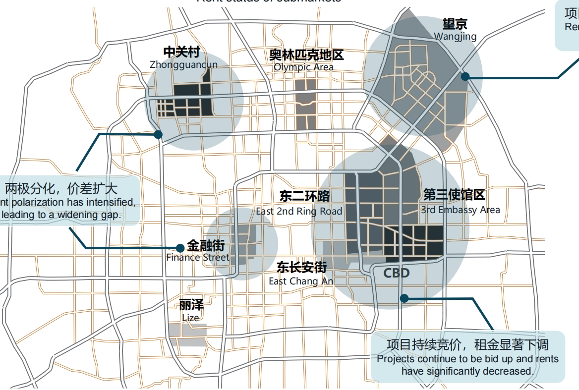 租金方面,甲級辦公樓平均租金降幅收窄。全市租金延續(xù)了前幾個季度的下行趨勢,環(huán)比下降4.0%,同比下降16.8%。在全市大部分區(qū)域租金持續(xù)大幅下行的情況下,中關(guān)村租賃市場因受科技行業(yè)租戶支撐,部分高入駐率項目租金已基本止跌。