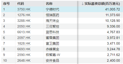 在IPO項(xiàng)目中,前十大募資項(xiàng)目里有3家公司募資規(guī)模超過百億港元。其中,寧德時(shí)代一家就達(dá)到410億港元,占2025年以來IPO募資總額的三成以上;恒瑞醫(yī)藥、海天味業(yè)募資超百億港元,三花智控達(dá)到93億港元。