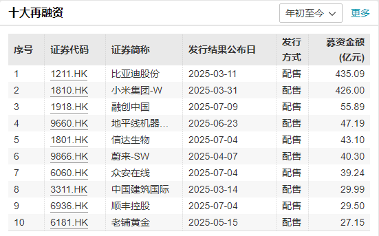 在再融資方面,龍頭公司同樣發(fā)揮了巨大作用。前十大再融資項(xiàng)目中,比亞迪股份和小米集團(tuán)兩大龍頭募資金額均超過400億港元,合計(jì)達(dá)861億港元,占2025年以來再融資項(xiàng)目總額的五成以上。