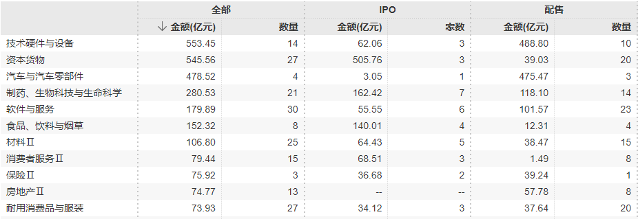 Wind數(shù)據(jù)顯示,在Wind二級(jí)行業(yè)分類下,技術(shù)硬件與設(shè)備、資本貨物、汽車與汽車零部件這三大行業(yè)的募資規(guī)模位居前三;制藥、生物科技與生命科學(xué),軟件與服務(wù),食品、飲料與煙草,材料Ⅱ等行業(yè)的募資規(guī)模也超過百億港元。