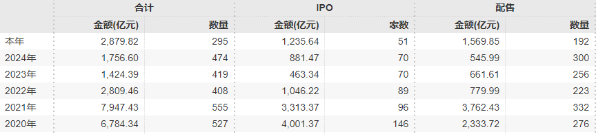 Wind數(shù)據(jù)顯示,2025年以來,港股市場(chǎng)股權(quán)融資規(guī)模達(dá)到2879.82億港元,遠(yuǎn)高于2023年和2024年全年的1424.39億港元和1756.60億港元,甚至超過了2022年全年的2809.46億港元。