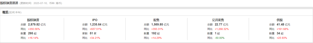 據(jù)Wind數(shù)據(jù)顯示,2025年以來,港股市場(chǎng)股權(quán)融資規(guī)模已接近3000億港元,達(dá)到2879.82億港元,同比大幅增長(zhǎng)350.56%。