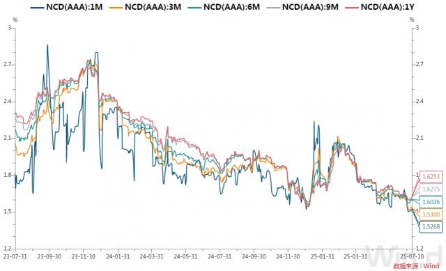 全國和主要股份制銀行一年期同業(yè)存單最新成交價(jià)在1.62%附近,較上一日小幅上升。