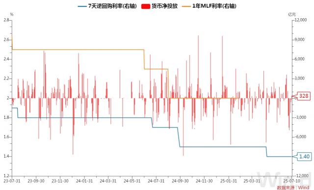 央行于7月10日采用固定利率、數(shù)量招標(biāo)方式開展了900億元7天期逆回購操作,操作利率為1.40%,投標(biāo)量和中標(biāo)量均為900億元。據(jù)Wind數(shù)據(jù),當(dāng)日有572億元逆回購到期,所以單日凈投放328億元。