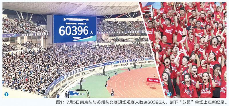 7月5日,南京隊(duì)與蘇州隊(duì)比賽進(jìn)行到第75分鐘,現(xiàn)場(chǎng)電子大屏顯示本場(chǎng)觀賽人數(shù)為60396人,創(chuàng)下“蘇超”(江蘇省城市足球聯(lián)賽)單場(chǎng)上座新紀(jì)錄,這也是中國業(yè)余足球賽事觀賽人數(shù)新紀(jì)錄。