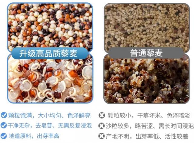 普通藜麥顆粒小且干癟,雜質和灰塵多,不僅影響口感,質量安全也難以保證。
