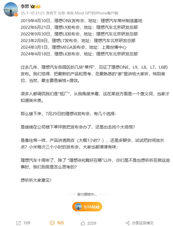 李想回應(yīng)理想被調(diào)侃“摳廠”:當(dāng)家方知柴米貴,糾結(jié)i8發(fā)布會選址