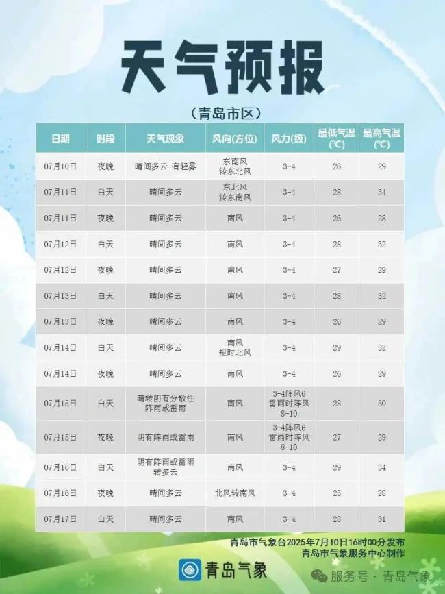 青島市氣象臺2025年7月10日14時00分發(fā)布青島市區(qū)未來一周天氣。