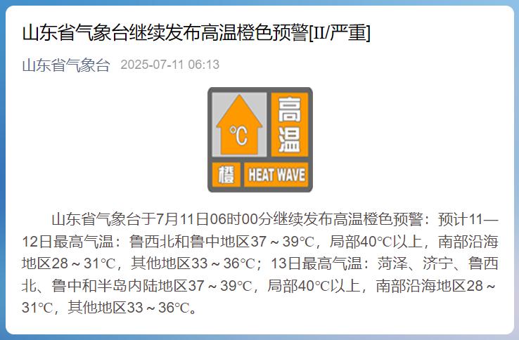 7月11日06時00分,山東省氣象臺繼續(xù)發(fā)布高溫橙色預(yù)警。