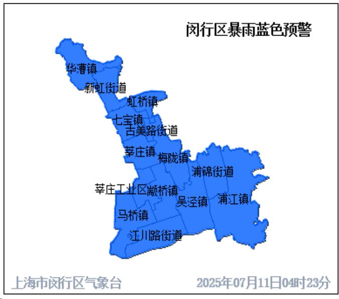 閔行預(yù)警發(fā)布中心于2025年7月11日4時(shí)23分發(fā)布暴雨藍(lán)色預(yù)警信號(hào):