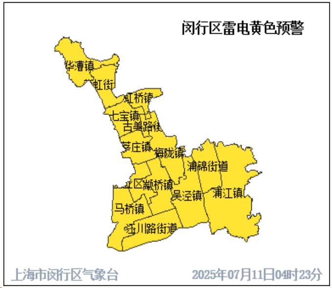 閔行預(yù)警發(fā)布中心在2025年7月11日4時(shí)23分還繼續(xù)發(fā)布了雷電黃色預(yù)警信號(hào):