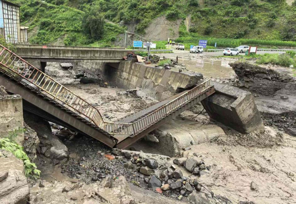 22時(shí)28分,黑溝、潘溝發(fā)生泥石流災(zāi)害,黑溝村和扒灣村道路中斷、橋梁垮塌、房屋受損,其余村組基礎(chǔ)設(shè)施也損毀嚴(yán)重。