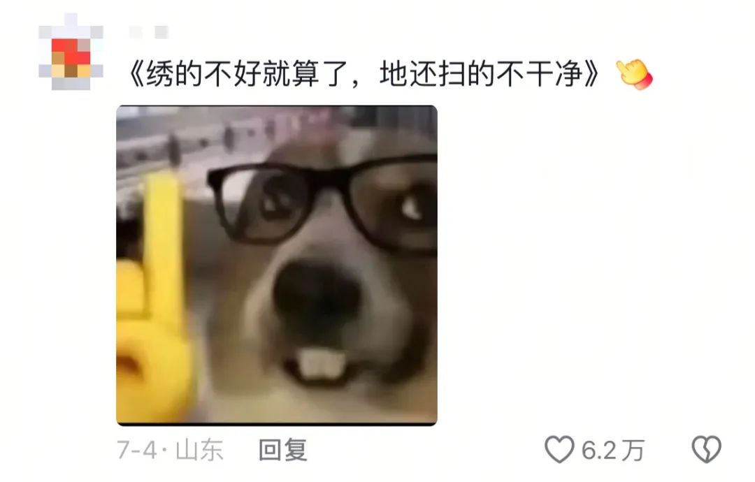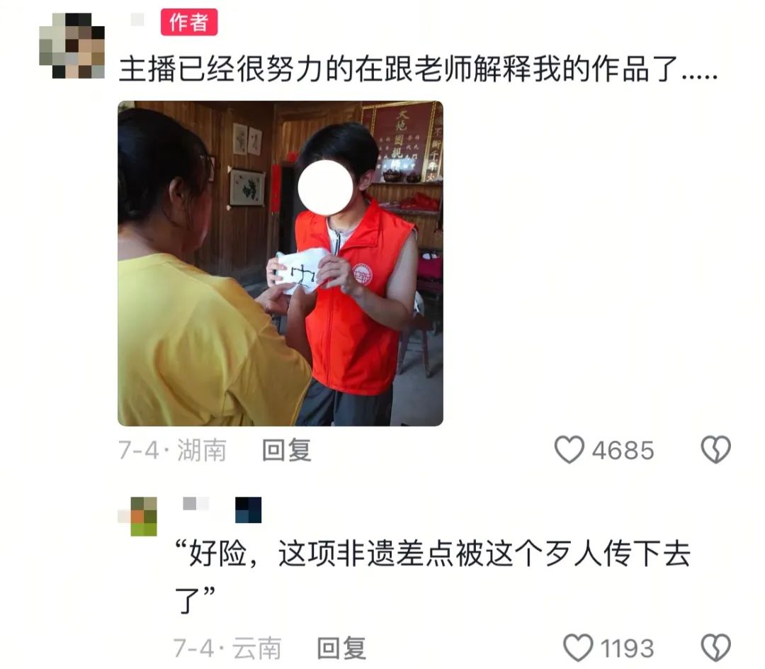 看到視頻的網(wǎng)友剛想表示“不至于吧”,但在看見作品后“一秒變臉”。網(wǎng)友調(diào)侃道:“第一眼:什么傳承人要求這么嚴(yán);第二眼:罰得輕了?!边€有網(wǎng)友說:“非遺傳承人:好險,這項非遺差點被這小子傳承了”。