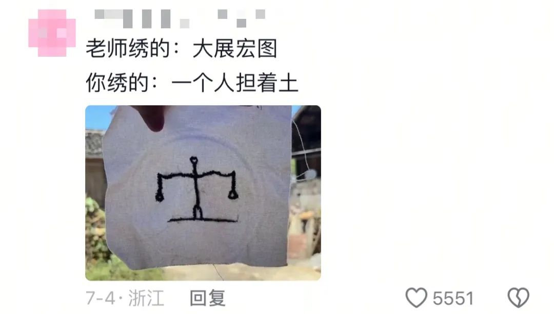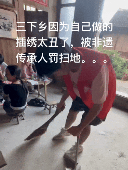 近日,一段視頻在網(wǎng)絡(luò)走紅。大學(xué)生參與“三下鄉(xiāng)”社會實踐,學(xué)習(xí)非遺插繡制作技藝。然而,因為制作的作品實在是“太丑”,被非遺傳承老師懲罰掃地。