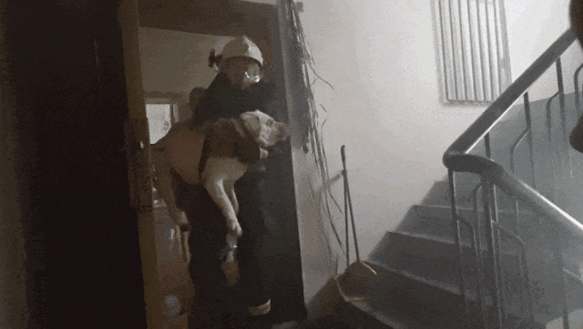 斷電后,消防員持水槍進(jìn)入火場(chǎng),撲滅了屋內(nèi)火勢(shì),同時(shí)檢查周邊樓層有無人員被困,隨后在樓上救出一只狗狗。