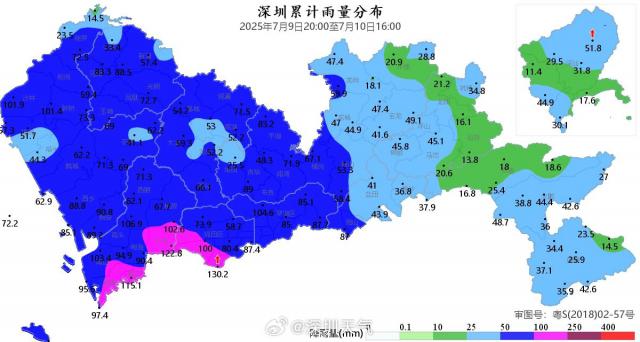 7月9日21時至7月10日16時,受臺風“丹娜絲”外圍環(huán)流影響,深圳出現(xiàn)多輪強雷雨。全市平均降雨量58.5毫米,最大累計雨量130.2毫米(福田福保站),最大小時雨量71.0毫米(南山世界之窗站)。期間,深圳最大陣風9級(21.0米/秒,鹽田海山站),深汕最大陣風7級(16.3米/秒,深汕芒嶼島站)。