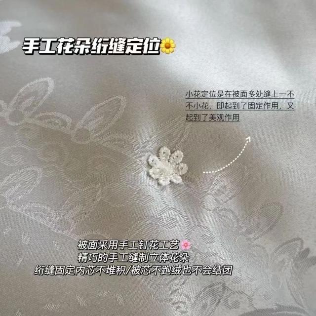 ? 匠心細節(jié),不將就:手工立體花朵絎縫,鎖住內(nèi)芯,蠶絲均勻服帖,不跑不團,被面提花精致有檔次。